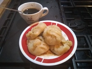 Because the dough was so thick, I only used half the chicken. So I went out and bought some pre-made dumpling wrappers, which cost two dollars and are absolutely worth it. I used up the rest of the chicken easily and made some good, simple non-soup dumplings and still had about half the wrappers left. Which brings us to this morning.