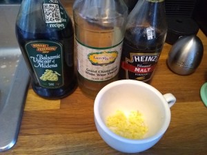 The dipping sauce is pretty much just vinegar with ginger in it. The recipe I’m basing it on called for Chinese black vinegar, which I didn’t have, or substituting that for a mixture of balsamic vinegar and rice vinegar, which I also didn’t have. What I had was: balsamic vinegar*, malt vinegar*, and white wine vinegar. The white wine vinegar belonged to a friend who died around this time last year. I mixed them (about half and half white wine and balsamic with just a splash of the malt) with some minced ginger and microwaved it for 30 seconds.