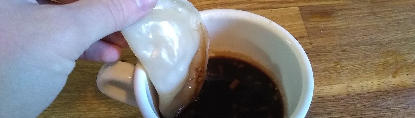 The dipping sauce is pretty much just vinegar with ginger in it. The recipe I’m basing it on called for Chinese black vinegar, which I didn’t have, or substituting that for a mixture of balsamic vinegar and rice vinegar, which I also didn’t have. What I had was: balsamic vinegar*, malt vinegar*, and white wine vinegar. The white wine vinegar belonged to a friend who died around this time last year. I mixed them (about half and half white wine and balsamic with just a splash of the malt) with some minced ginger and microwaved it for 30 seconds.