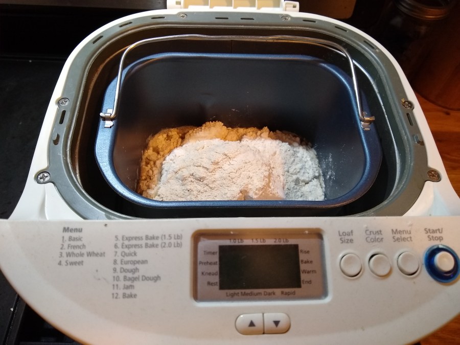 I made my bagels based on a recipe by Kelsey of “Full of Days”, who in turn based her recipe on one by Jami of “An Oregon Cottage”. This time I wasn’t going to make the mistake I made last time; I used the bread machine to knead the dough and left it in to rise.