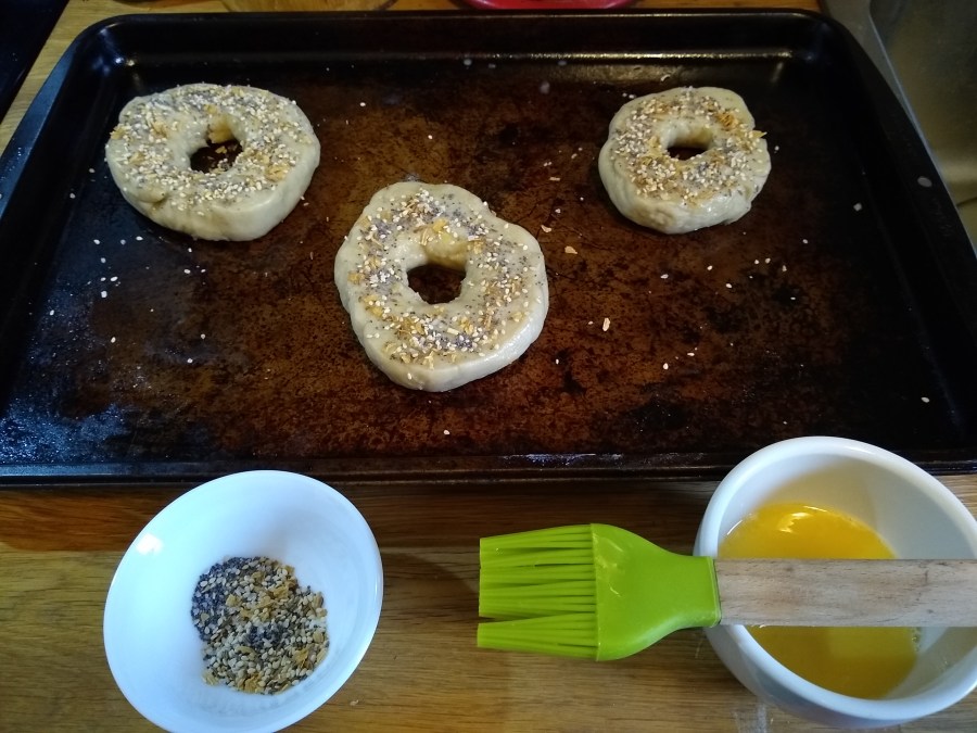 The bagels are brushed with an egg wash and topped with poppy seed, sesame seed, dried onion, coarse sea salt, and a little caraway seed. All of the toppings are store-bought. I have a pretty large collection of herbs and spices that have lasted me a long time. I saved the rest of the egg wash to eat later.