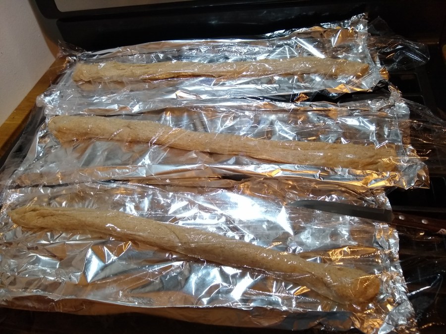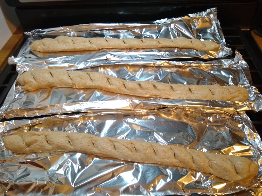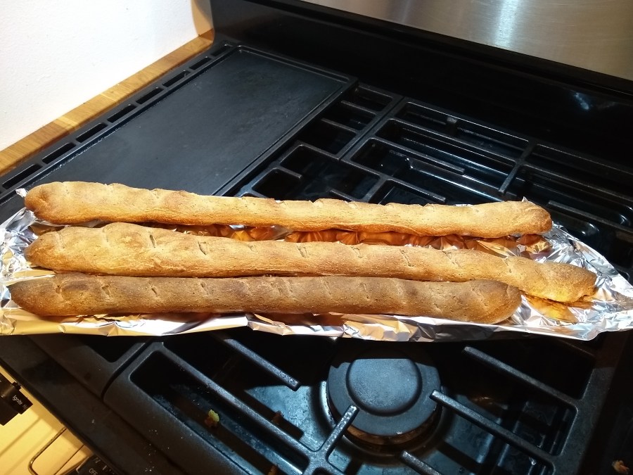 Since this week I found no bread at all; to eat with my cheese, I baked some thin crusty sourdough baguettes based on a recipe from King Arthur Flour. I used a mixture of white and whole wheat flour and baked them on aluminum foil because I didn’t have long enough pans.