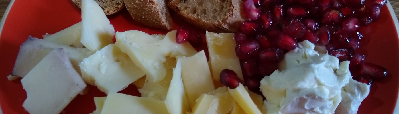 From left to right: Bella Vitano Merlot, Prairie Breeze Milton, Rembrandt Gouda, and Délice de Bourgogne. The Bella Vitano is sort of halfway between a Parmesan and a cheddar or Gouda, with a hint of red wine. The Milton is a good moderately sharp white cheddar, something I likely would have taken more of if I had not been put off by the name “Milton,” which led me to believe it would be a mild, bland cheese. Rembrandt Gouda is one of my favorite cheeses, though I prefer an older Gouda if I can get it. The more crunchy little nodules the better. Délice de Bourgogne is like a soft, slightly sweet creamy brie.