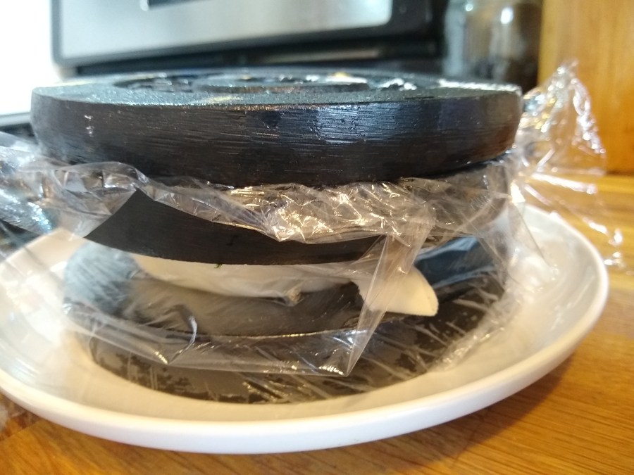 There was still little progress and no liquid on the plate, and suspecting that the cloth was holding moisture into the cheese rather than allowing it to leach out, I unwrapped the cheese and wrapped the whole plate in plastic wrap. This helped a lot and for the next few days I continued flipping and salting the cheese.