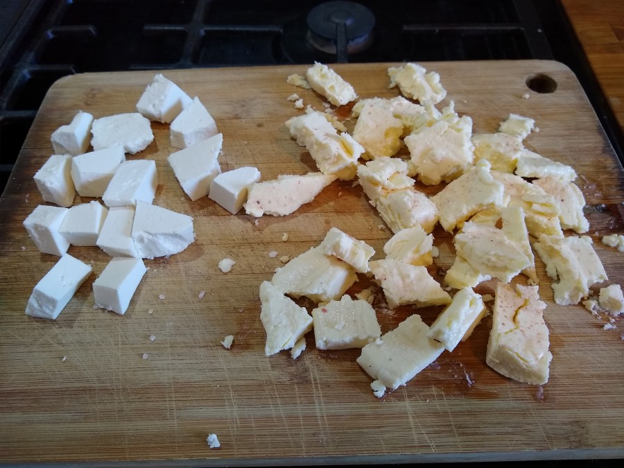 Today is my birthday so I decided today the cheese would be ready whether it was firm enough or not. It was not as hard or as white as the commercially produced ricotta salata, pictured above on the left, but it was still firm enough to cut and firm enough not to fall apart. I rinsed the cheese to remove excess salt before cooking.