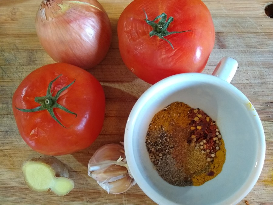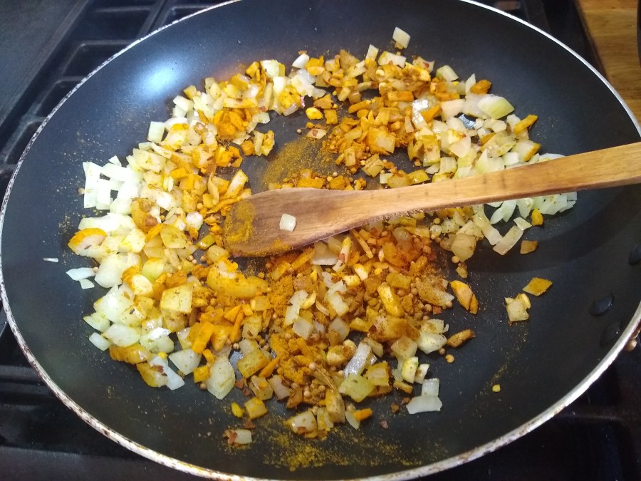 I started by sauteing an onion and then added fresh garlic** and ginger and a blend of spices: turmeric, coriander, cumin, red pepper flakes, cinnamon, curry powder, cardamom, nutmeg, cloves and salt. The spices I used were entirely store-bought. I know I’ve had the jar of cardamom for at least nine years, because I packed my spices with my clothes when I shipped them to myself when I left home for college, and the jar became unscrewed in the box and made my sweaters smell very nice.