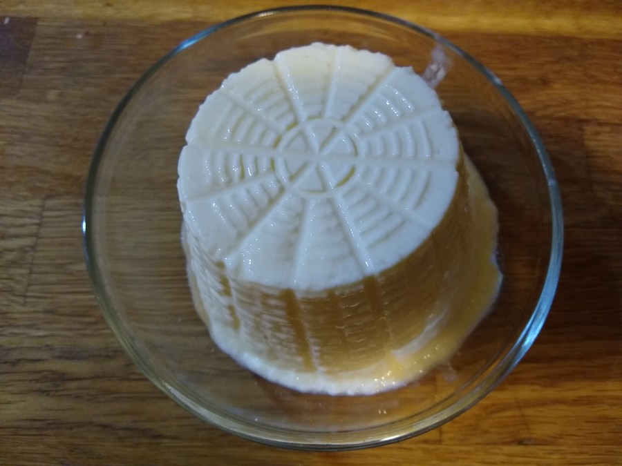 “Basket ricotta” comes in a small plastic basket that leaves an impression on the cheese when overturned. It is already a bit firmer than regular ricotta. I wanted to use the basket as a container to press the cheese in, but the weights wouldn’t fit inside.