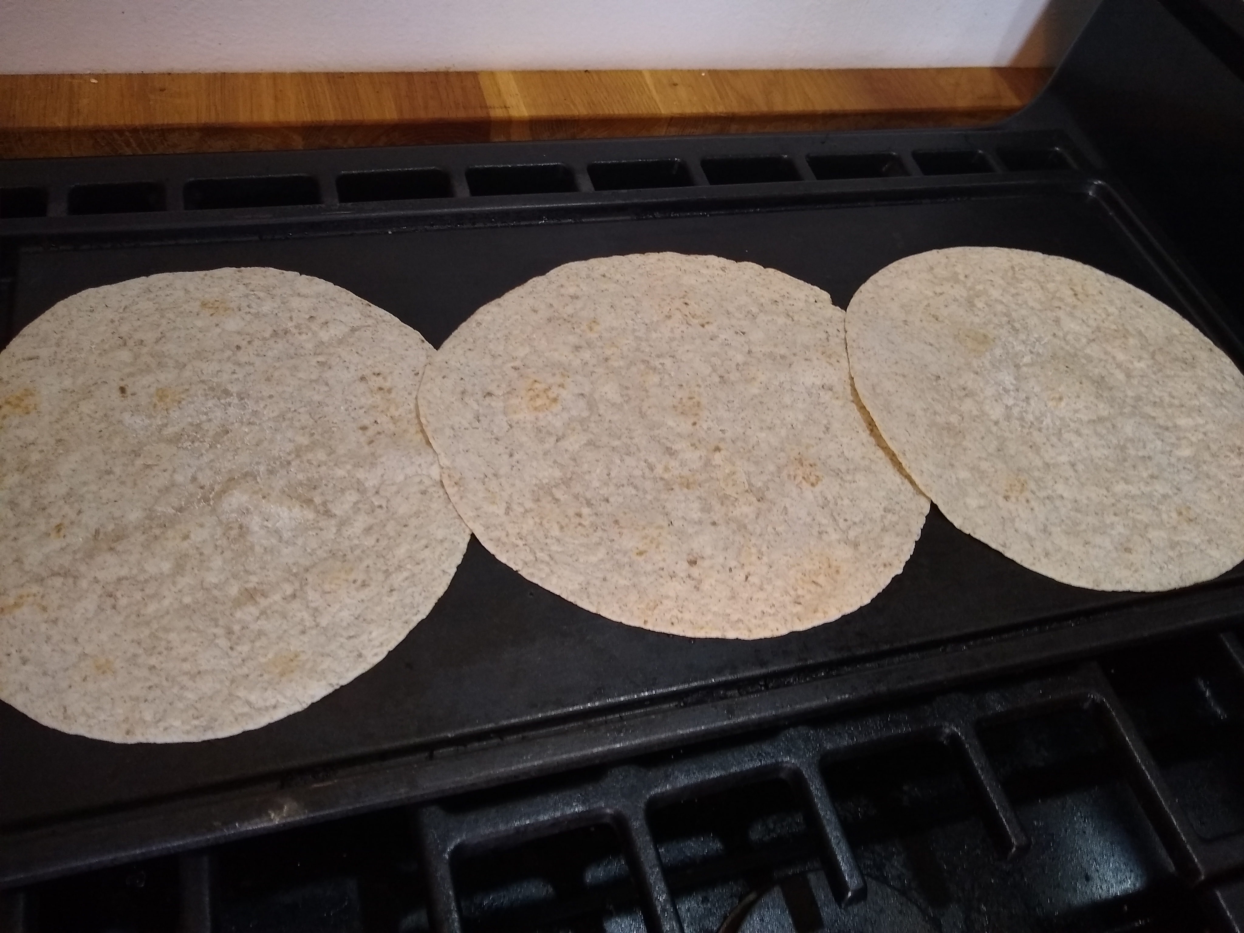 While the falafel was baking I chopped some of the arugula (honestly, fresher than what I see on the shelf in the store half the time) and mixed in a little parsley and scallion from my herb plants, and heated up the tortillas on the griddle until they puffed up and browned a little.