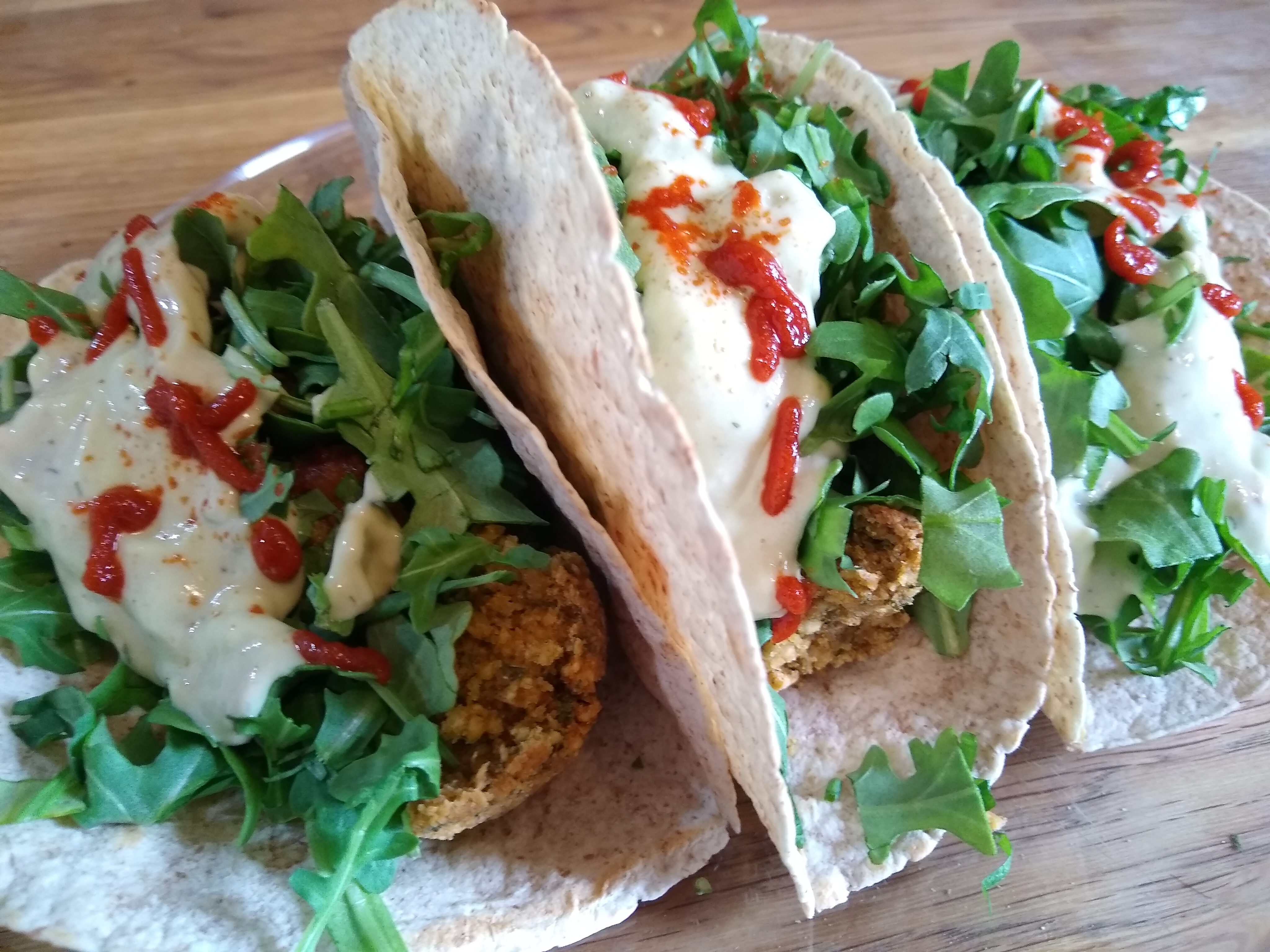 I broke up some of the falafel and put it on the tortillas with some salsa (surprised this stuff is still good), arugula and herbs, avocado tzatziki and sriracha (store-bought, a long time ago, and almost empty so I was unable to make an appealing pattern on the tacos with it).