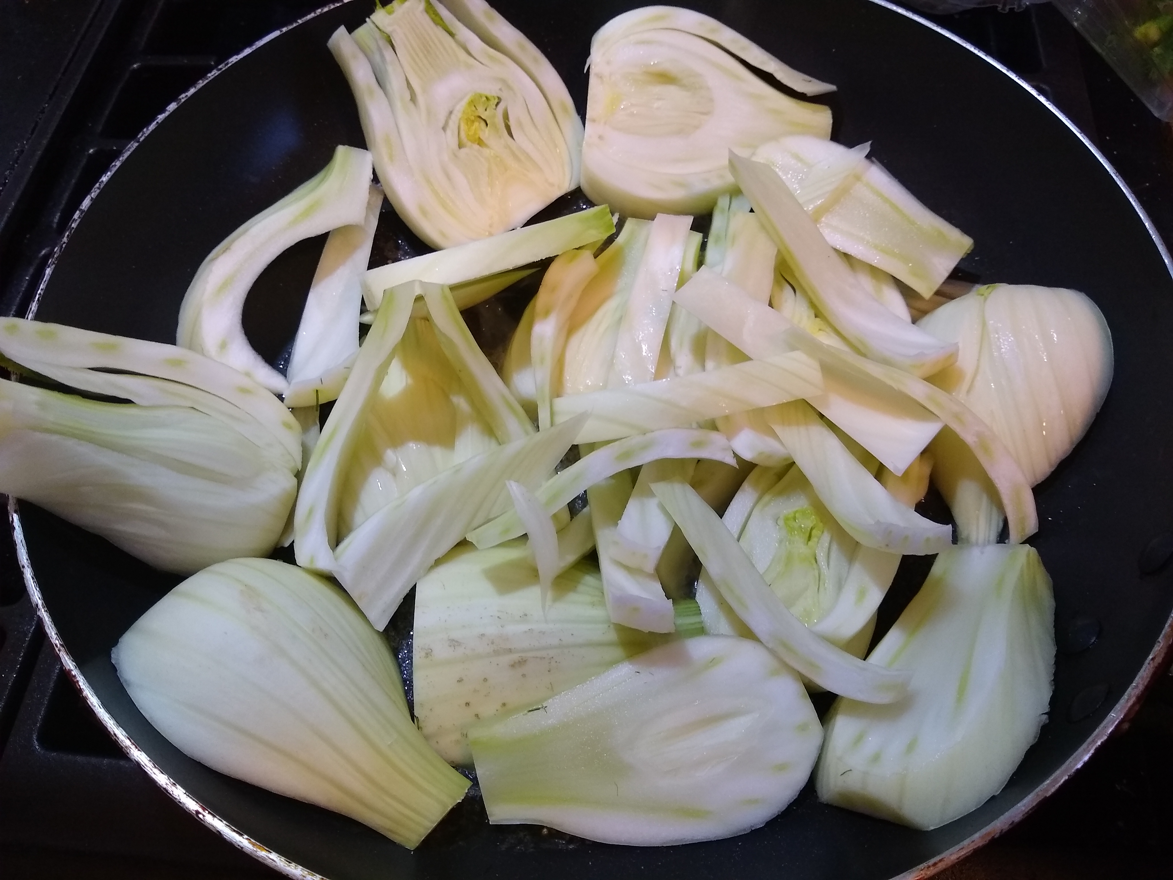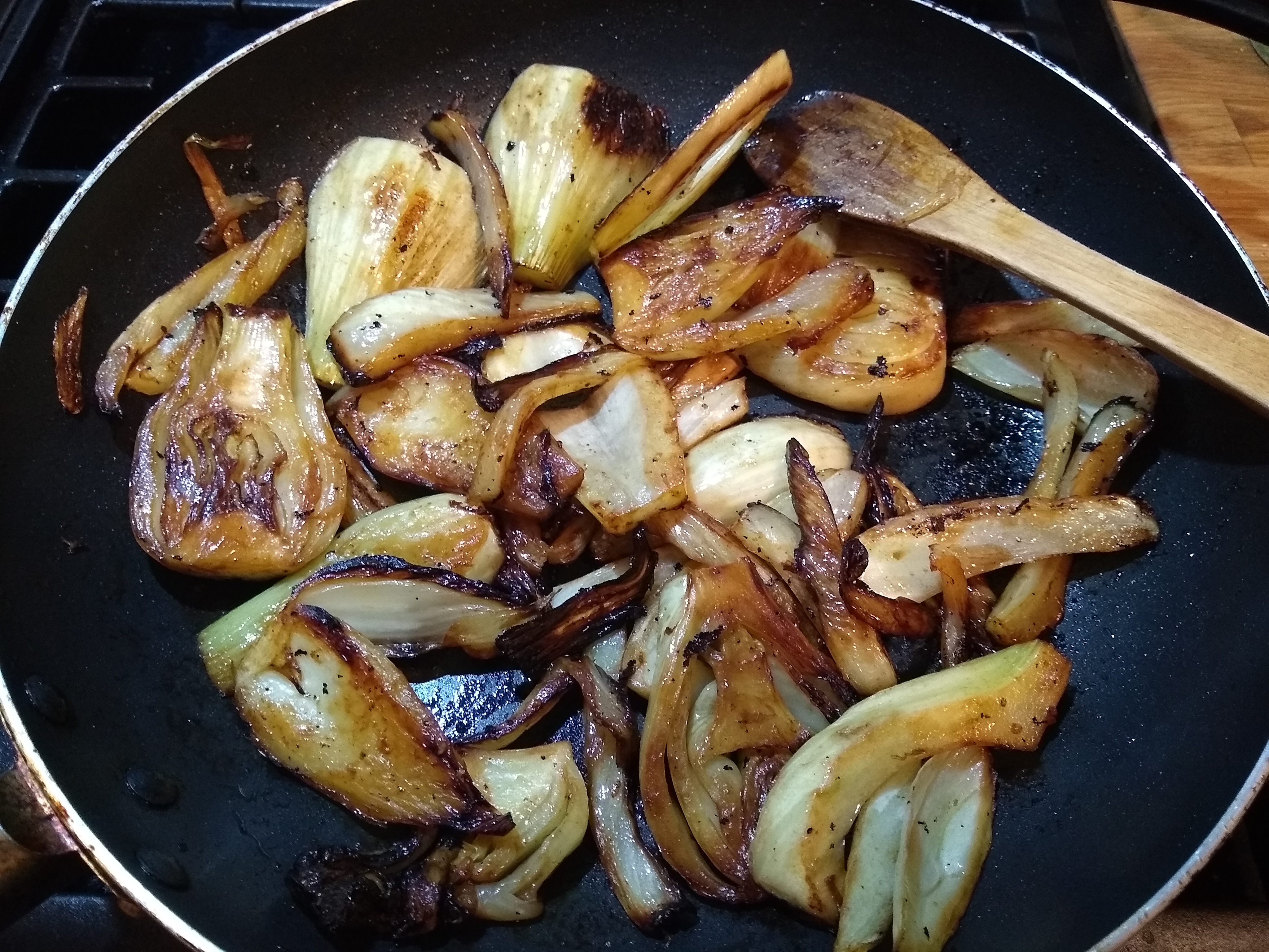 I started with the fennel, using a recipe from Adventures in Cooking, slowly cooking sliced fennel in butter, olive oil, sugar, salt and pepper until soft and dark, then tossing it with lemon zest, anise seed*, garlic*, dried dill*, fennel fronds and goat cheese (which was too soft to crumble neatly as in the original recipe). While this was cooking I worked on the wings.