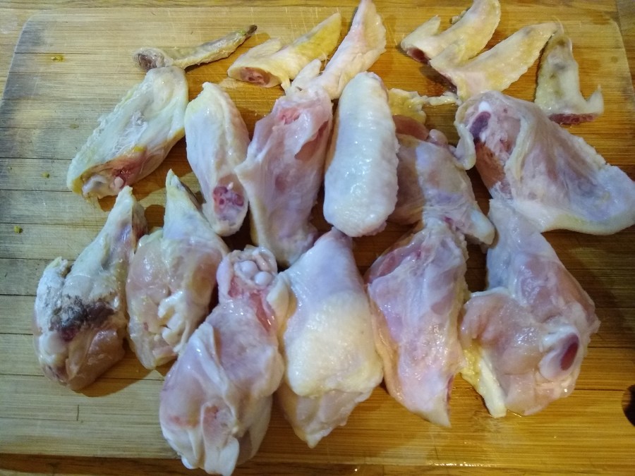Roughly following a recipe from delish.com, I cut up the chicken wings and soaked them for a while in buttermilk (not in the recipe, but it seemed like a waste not to, even if they wouldn’t be marinated very long), then tossed them in olive oil, garlic powder*, salt and pepper* and baked them at 400°F for about 50 minutes, flipping them halfway through.