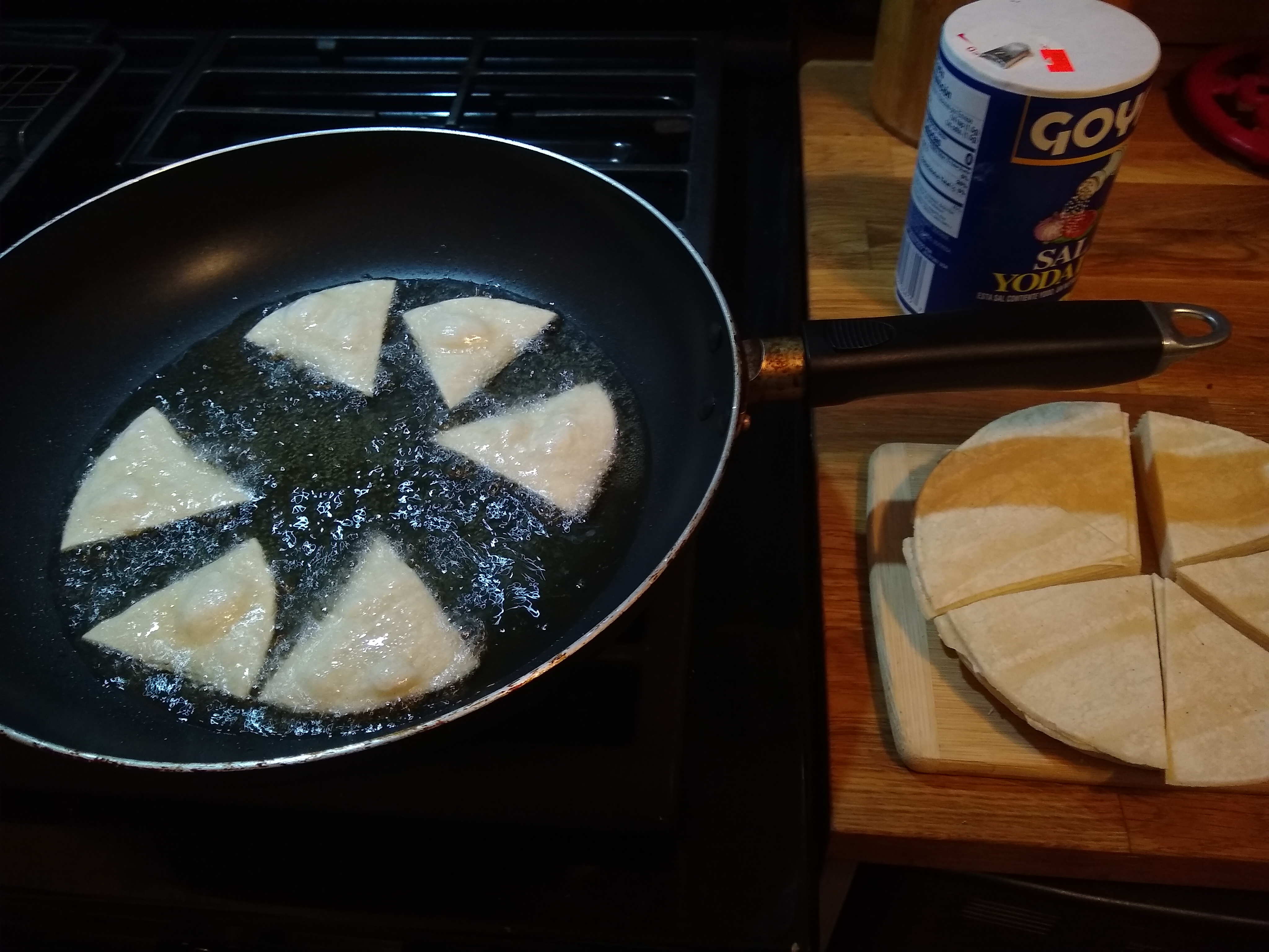 Tonight, though, I made my own tortilla chips. They’re pretty simple but kind of messy; cut corn tortillas into sixths and fry them in vegetable oil** (deep enough that they float) until they’re just slightly darkened (this takes about a minute), and sprinkle some salt** on them. This makes a vastly superior chip to anything you’ll get out of a bag, even if some of them are a little soggy in the middle. I made a lot of chips so I put the extra ones in a paper bag for later.
