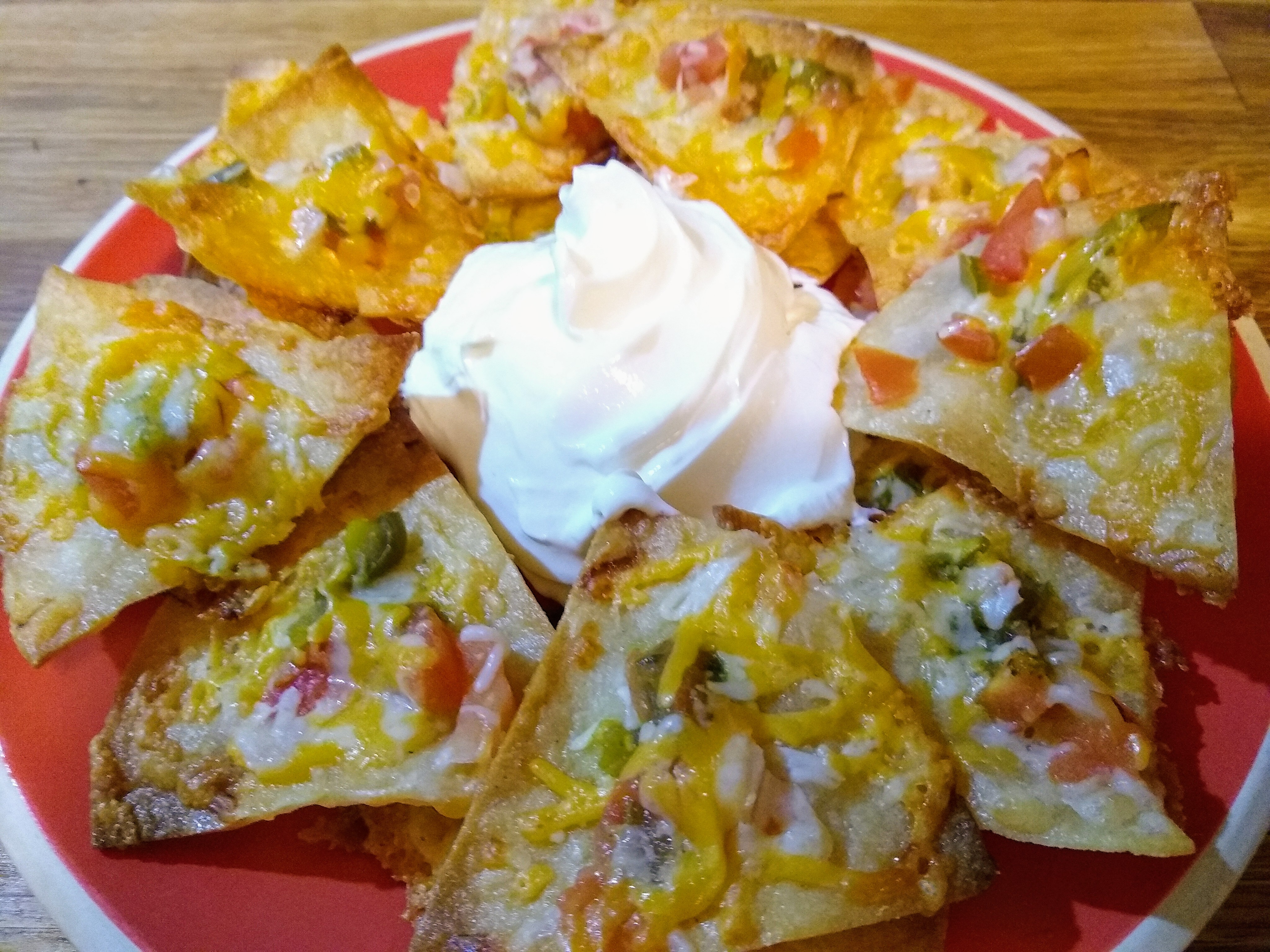 Toppings can vary but I usually use a dollop of refried beans, some pickled jalapeños, salsa, and shredded cheese. Sometimes I grate a little Parmesan or Asiago on top afterward to make them extra crunchy. This time I just used a little pickled jalapeños*, pico de gallo, hot sauce, and shredded Mexican cheese blend, and went a little light on everything so I wouldn’t overpower the fresh chips too much.