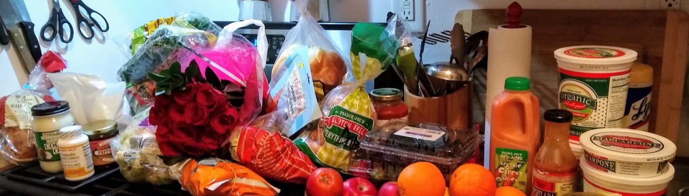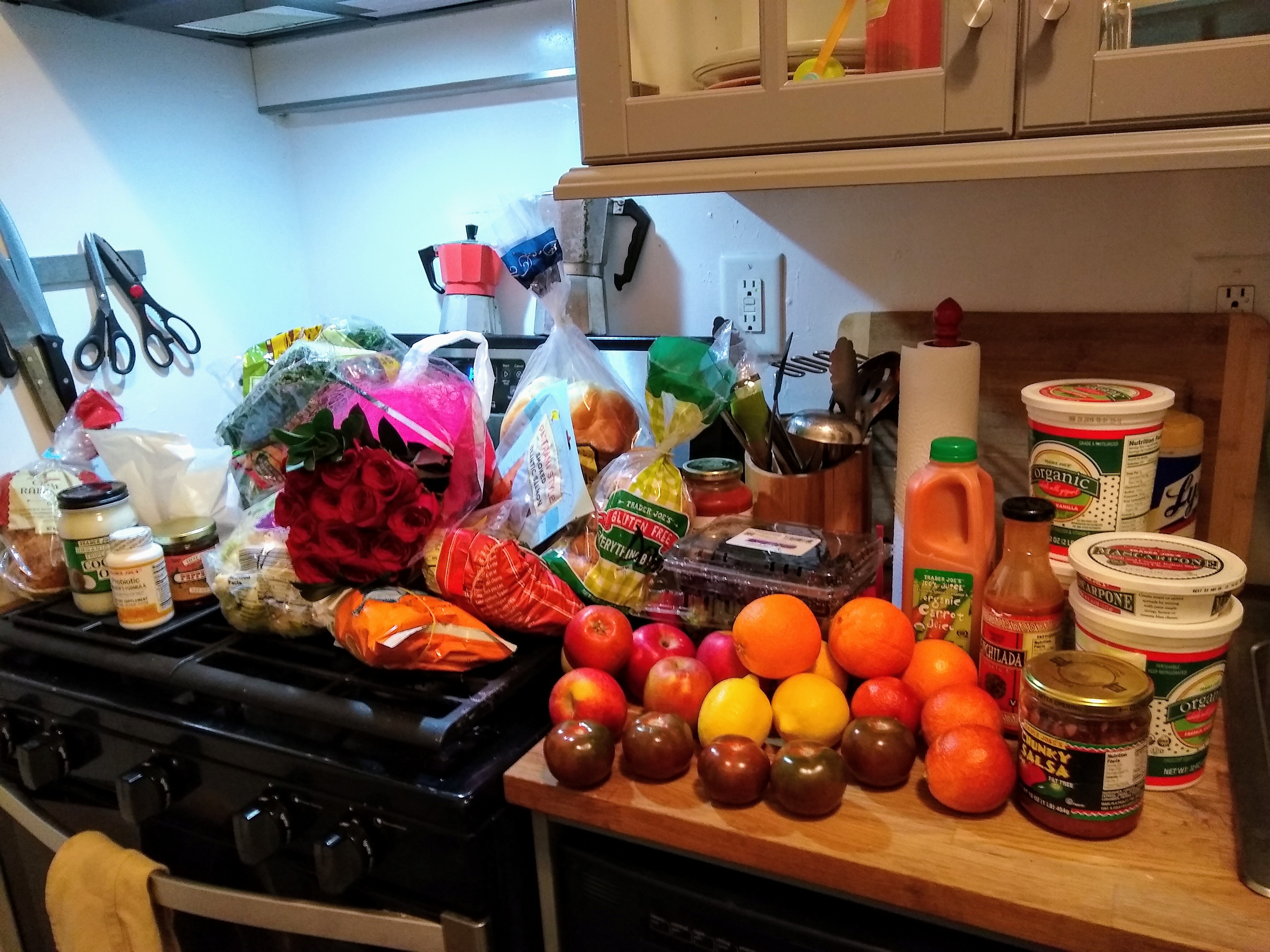 Last night went pretty well, considering I cut my finger on a piece of glass reaching for a jar of pasta sauce. We didn’t bother going to multiple places; it was freezing out, I was bleeding, there was no need since I mostly wanted fruit and yogurt and found plenty of both. They were throwing out a lot of flowers from Valentine’s day, so I took a nice bouquet of red roses for myself. There were also a lot of good unopened sauces and yogurts that whose only fault was being smeared with yogurt or mustard from a smashed container. Here’s what I got: