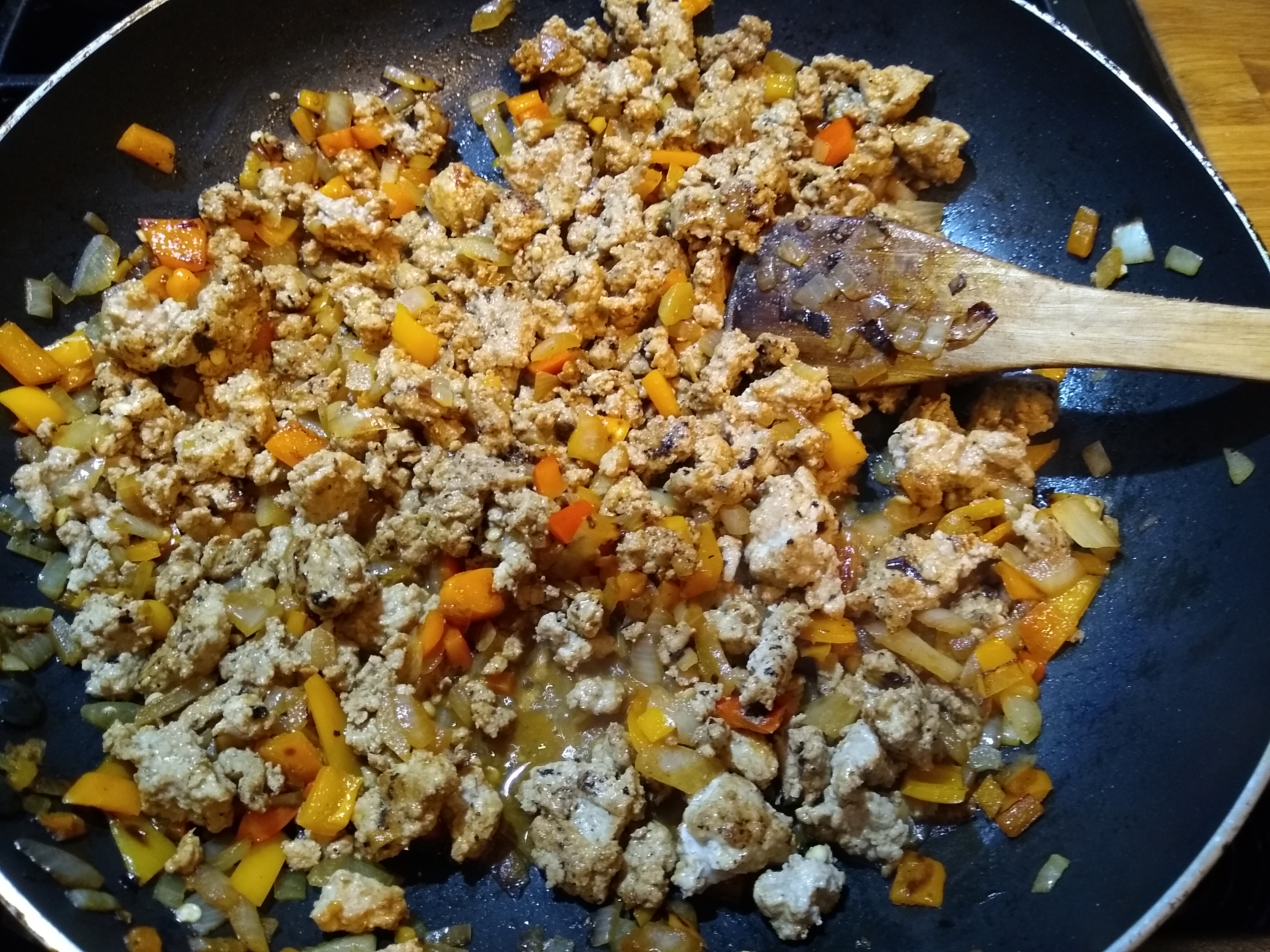 I had a pound of ground turkey in the freezer (while it was thawing, I shelled a bunch of peas that I thought were sugar snaps two weeks ago, but were actually regular peas, to freeze them) from months ago. I don’t really like turkey that much, so I looked up methods to make it taste more like beef. I figured a little Worcestershire sauce would help, and the first search result I found said to add that and some ground cumin* and coriander**, and mix it into the ground meat before cooking. That seemed appropriate, so I did that and also added a little paprika* for color. I diced and sauteed an onion* and some mini sweet peppers and then added the turkey.