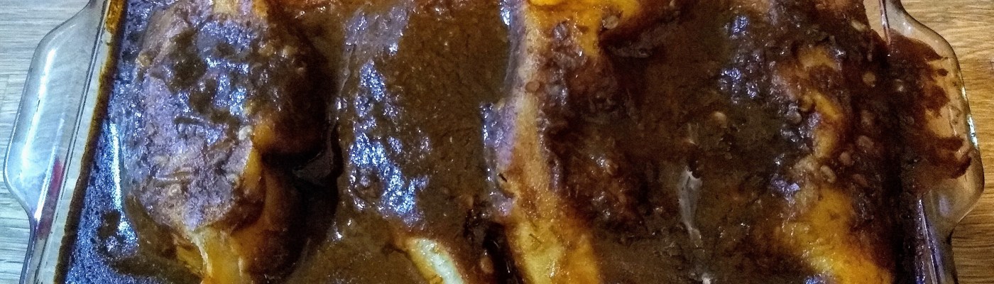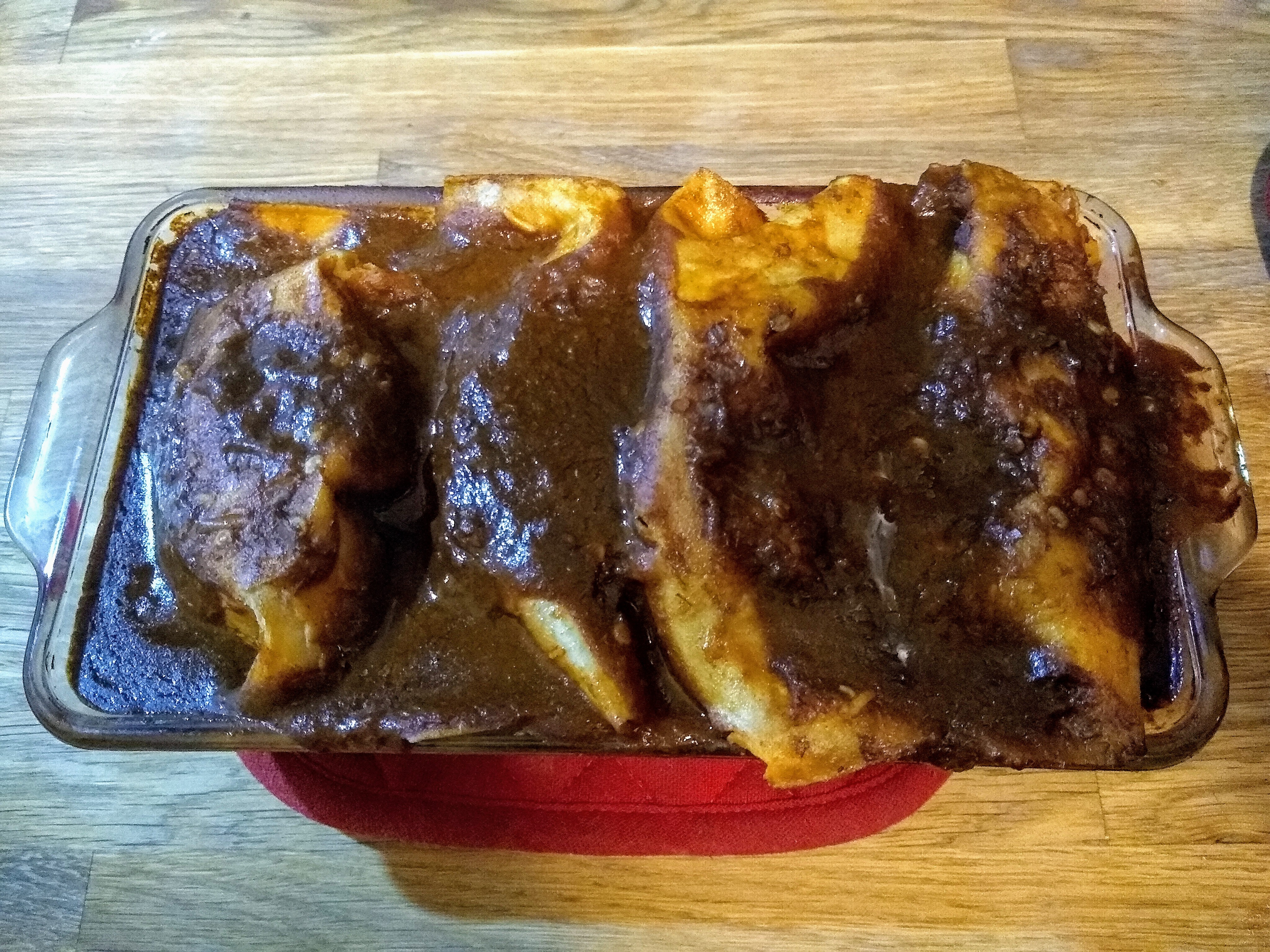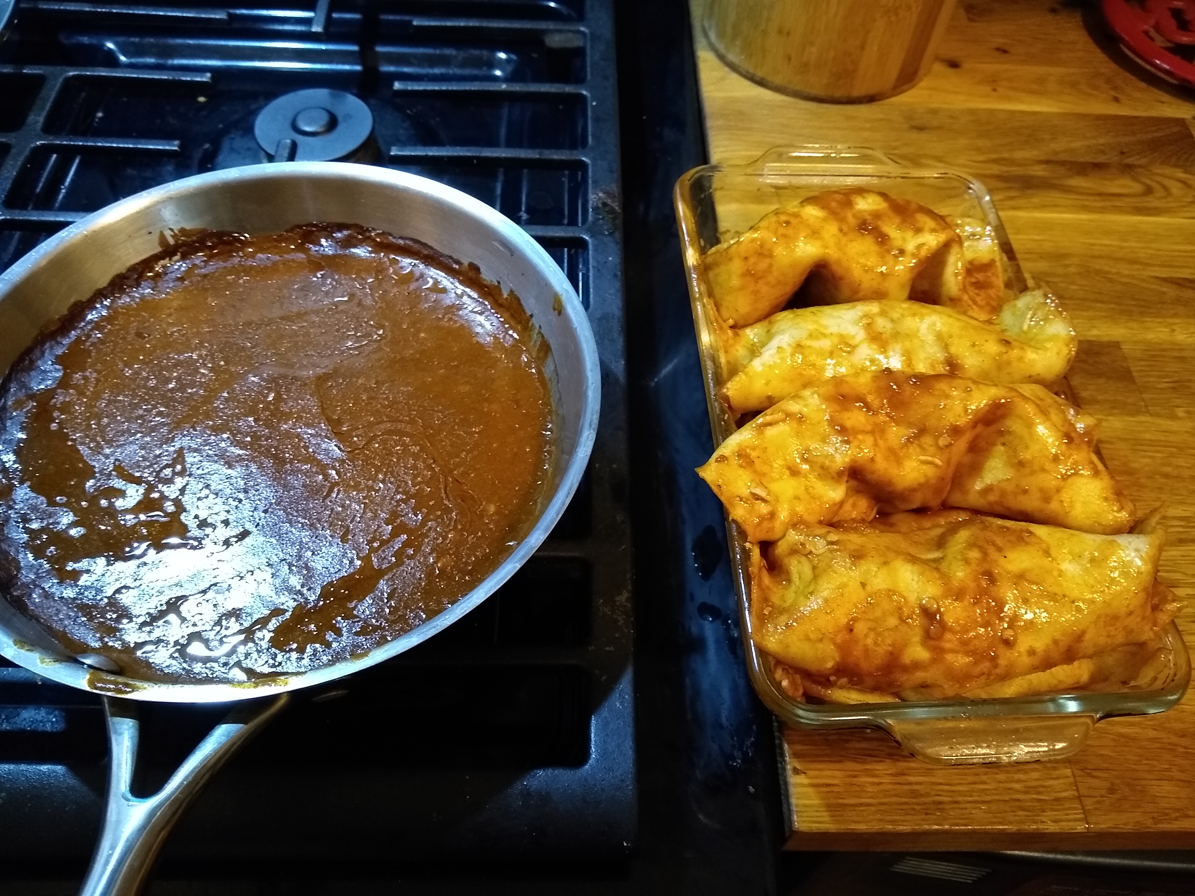 I blended a little leftover pico de gallo and a few soaked dried peppers of unknown type into the sauce to give it a little more depth. The instructions said to very briefly fry the tortillas in oil*** and then dip them into a pot of heated sauce (5 seconds in each) before filling and rolling them. I didn’t understand the purpose of this, or really know how to roll them properly, but I did it. I added a mixture of Mexican shredded cheese blend and chopped cheddar sticks and fit the enchiladas into a glass loaf pan, which turned out to be a bit too small, so I made two layers.