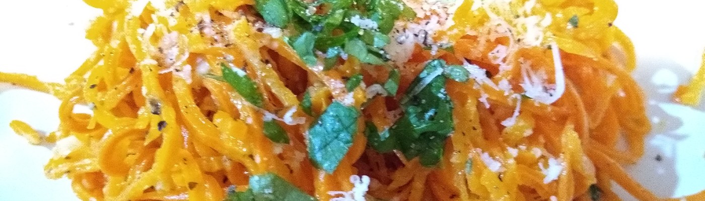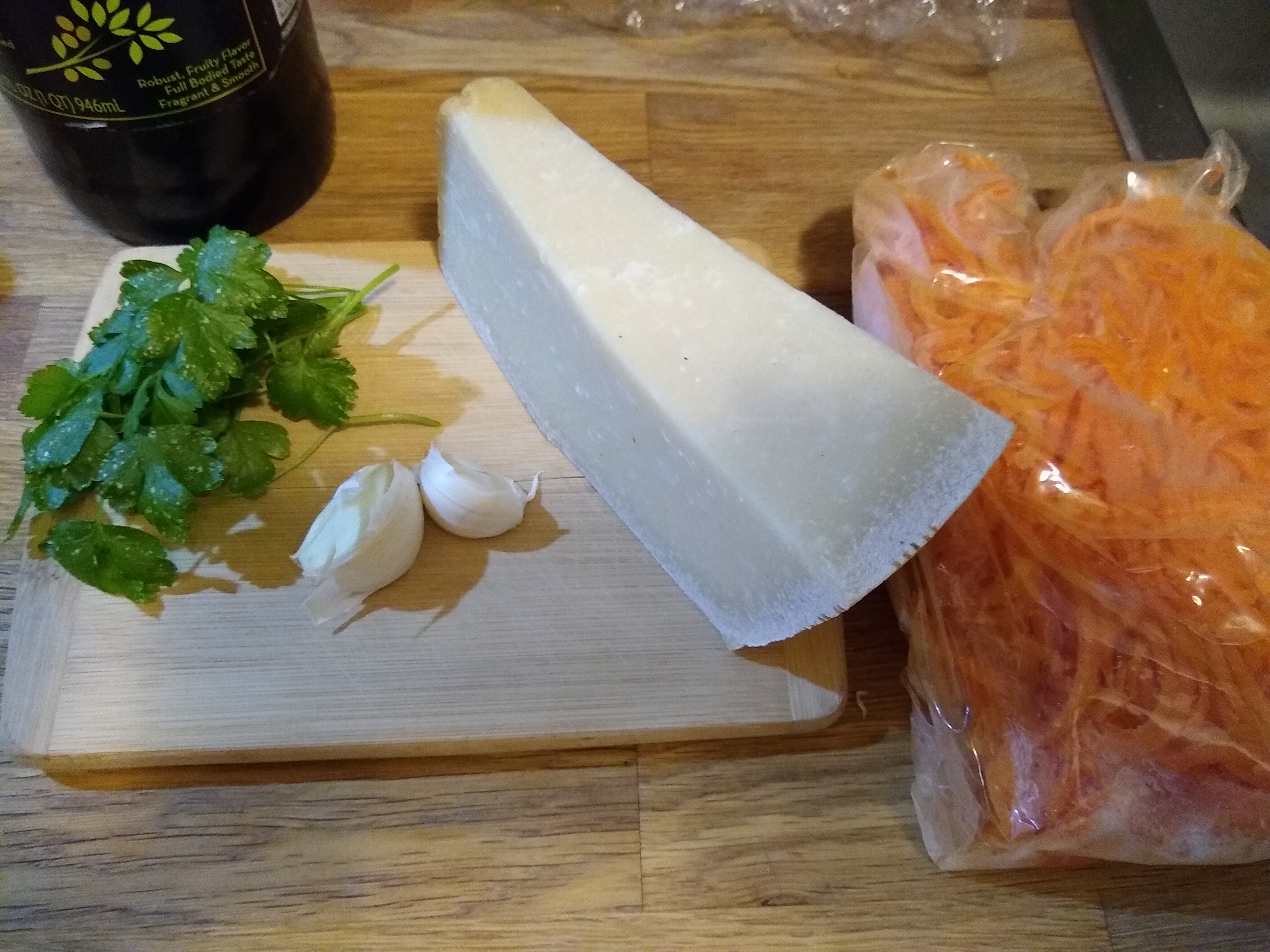 This one’s pretty simple. I found a box of frozen carrot spirals this week and wanted to make a quick dinner, so I sauteed a couple of cloves of garlic in a few tablespoons of olive oil, then added the block of noodles and cooked covered, turning occasionally, until they were thawed, which took about 10 minutes. Then I removed the lid, separated the noodles and let them cook a few more minutes, reduced the heat to low and added about 1/3 cup grated Parmesan, a few sprigs of chopped parsley**, and black pepper*.