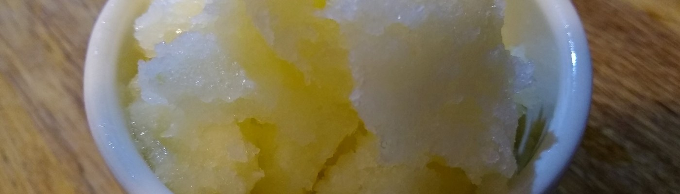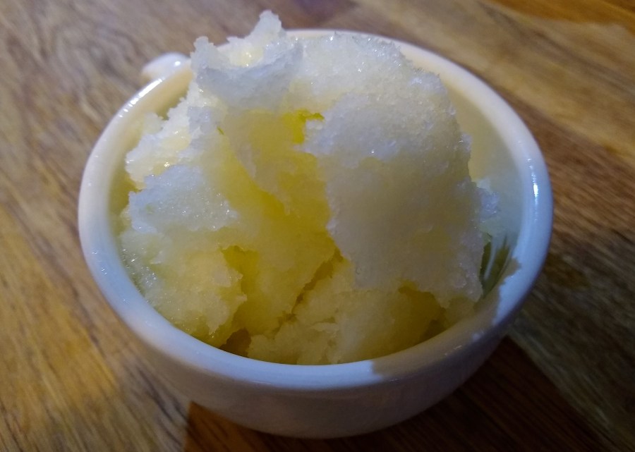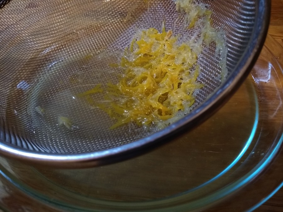 In addition to having never eaten fresh bergamot, I have never made sorbet. I found a basic recipe on Rose Cottage and quartered it. It involves boiling sugar and water (I used a bit over 1/3 cup sugar and 2/3 cups water) for three minutes, then removing it from the heat and allowing the zest (I used a julienne peeler, for the sake of convenience) of the bergamot to steep in it as it cools. Once it was cool, I added the juice and strained it into a pie plate to freeze. For the first few hours as ice crystals were forming I periodically stirred it, then let it freeze overnight.