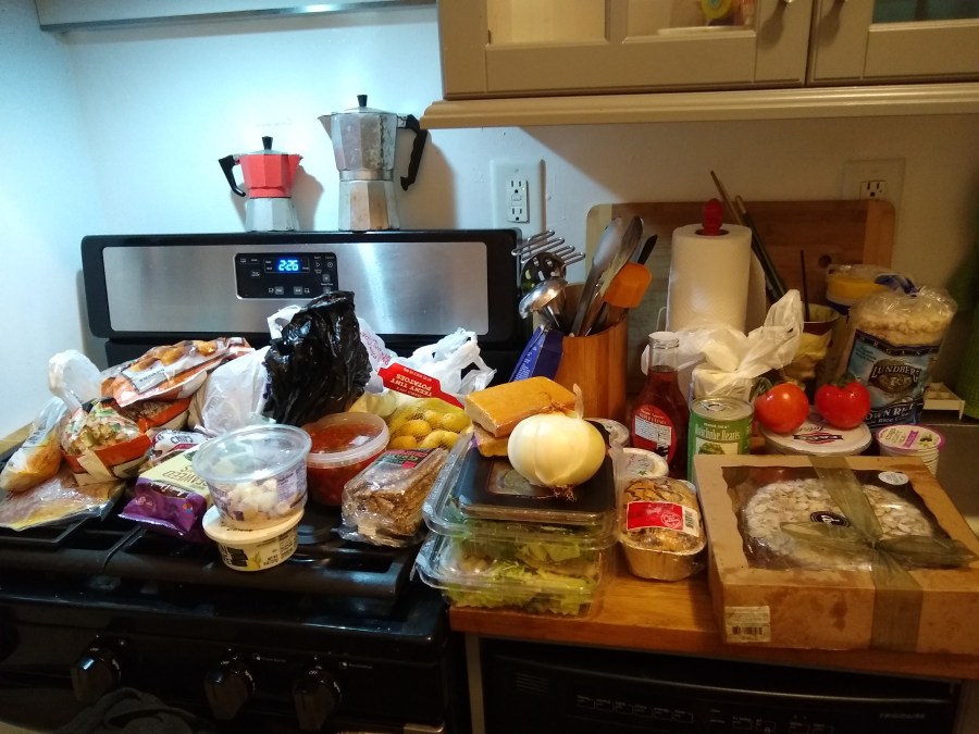 It was the first relatively warm night of the year, so we found other people out picking through the trash wherever we went, somewhat reducing an already light haul. The trash went out a bit later than usual. There was a lot of boxed-up broken glass, and I wondered if that was why. But a number of good things were found, and as usual most other people out there were pretty picky about what they were looking for. Among the more unusual things I didn’t keep for myself was a perfectly good boning knife. The staff of that store had stayed late to do a deep-cleaning and as a result they had filled trash bags erratically, and someone probably just lost the knife. I let my friend keep a package of gyoza on the condition that he invite me over to share them later. We found a two-quart box of chocolate soy milk, but upon opening it to share, found that it had gone terribly bad in a way that I was not aware a sealed self-stable package of soy milk could. Here’s what I got: