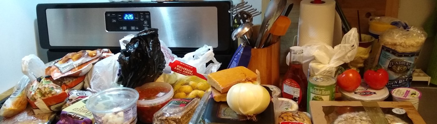 It was the first relatively warm night of the year, so we found other people out picking through the trash wherever we went, somewhat reducing an already light haul. The trash went out a bit later than usual. There was a lot of boxed-up broken glass, and I wondered if that was why. But a number of good things were found, and as usual most other people out there were pretty picky about what they were looking for. Among the more unusual things I didn’t keep for myself was a perfectly good boning knife. The staff of that store had stayed late to do a deep-cleaning and as a result they had filled trash bags erratically, and someone probably just lost the knife. I let my friend keep a package of gyoza on the condition that he invite me over to share them later. We found a two-quart box of chocolate soy milk, but upon opening it to share, found that it had gone terribly bad in a way that I was not aware a sealed self-stable package of soy milk could. Here’s what I got: