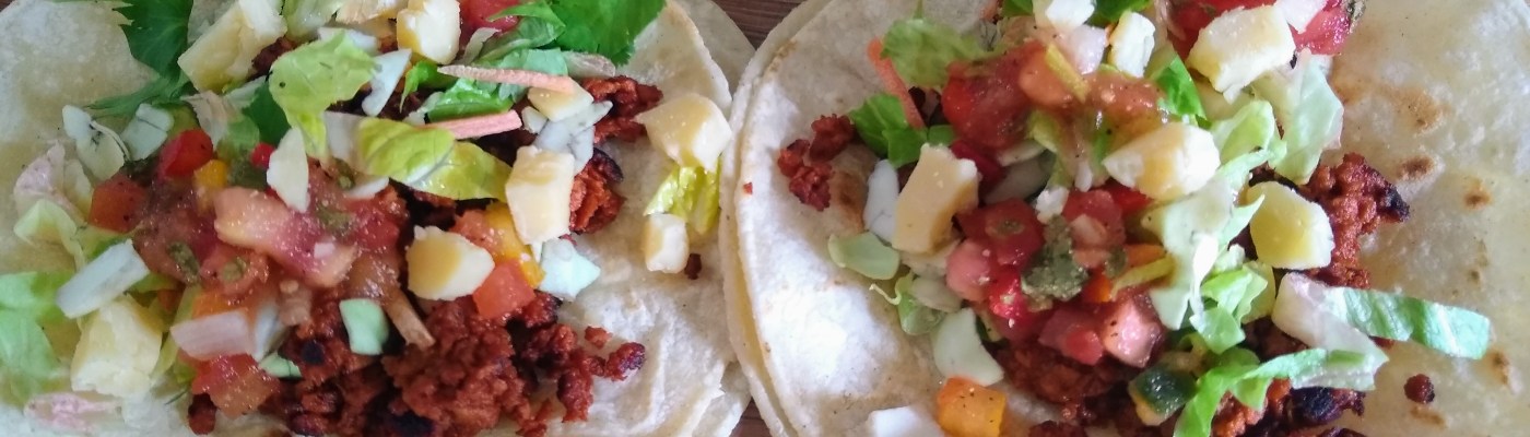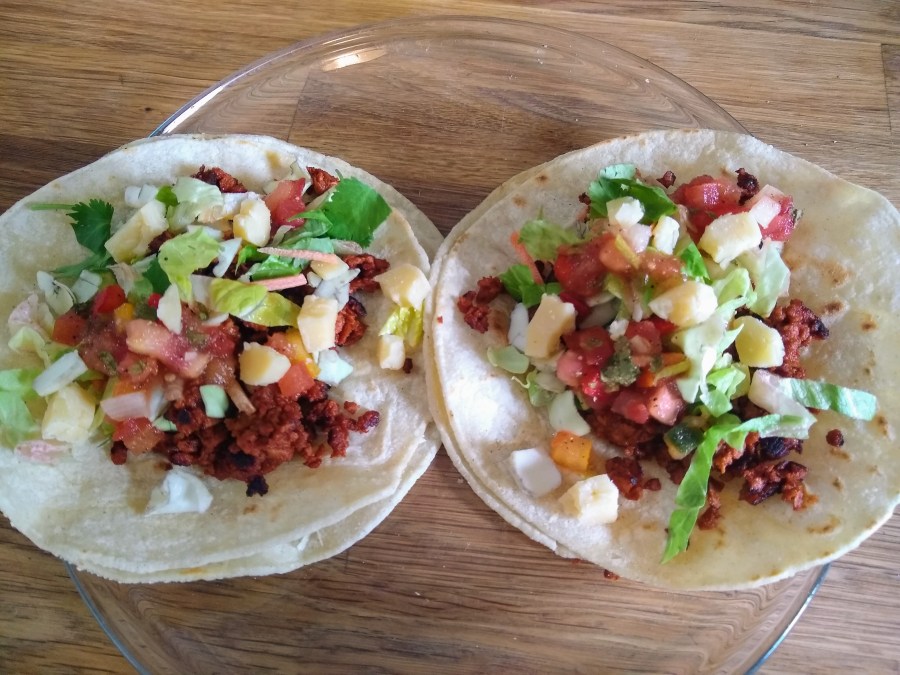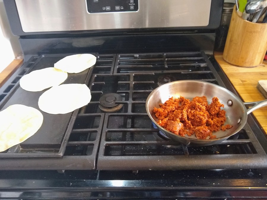 I’ve bought soy chorizo in the past and if there’s one thing I remember about it is that it stains everything red. The sausage is also kind of already crumbled inside the casing, so the sausage shape is really just there to make it look more appealing to customers. If you fry it in oil it does crisp up a lot like real chorizo, but not as well. But anyway I’ve still got some of those tortillas that I made nachos out of so I made myself a couple of tacos.