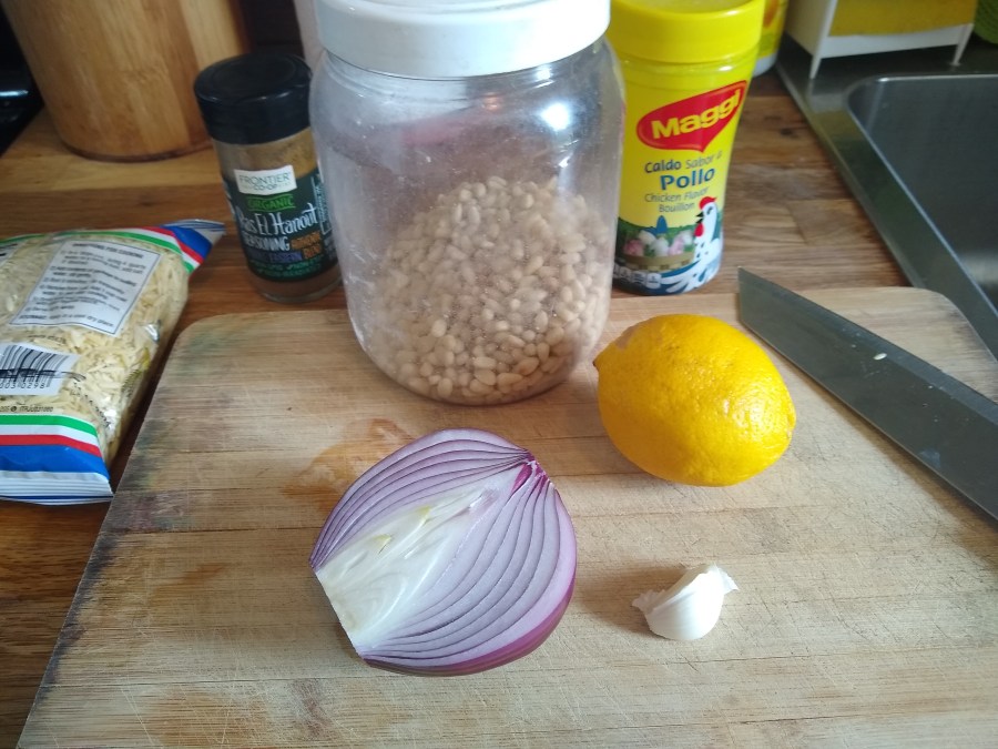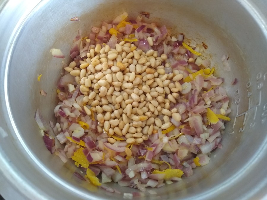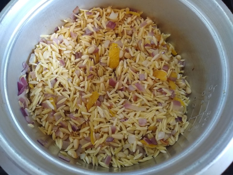 I start with half a red onion (use a shallot or two instead if you have them) a clove of garlic* and the zest of a lemon, sauteed in a little olive oil. When they start to brown, I add a few tablespoons of pine nuts and let them toast a little (keep stirring all of this until you add the liquid!), then add a cup of orzo. My pine nuts were already toasted, so I added the orzo right away.