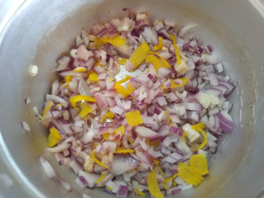 This is a recipe I normally make with couscous, but since I have orzo instead, I’m going to make it with orzo. It’s a one pot dish that involves putting the bowl of the rice cooker directly on the stove. If you’re not sure if your rice cooker can do that, it’s probably best to start it in another pot.