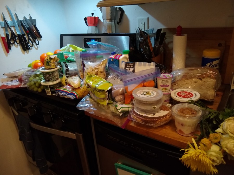 It was a somewhat sparse night, but a good night for pork. I think this was the first time I’d actually found a pork product other than bacon. Each of us went home with a little over a pound of pork tenderloin, some bratwurst, and tamales. We split a box of bean protein bars and a couple bags of good juice oranges. I found some key limes that were still in usable condition. We found about 2.5 dozen eggs and some lactose-free milk as well. Here’s what I got: