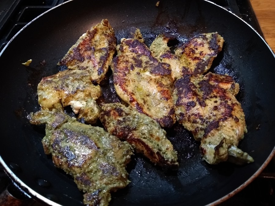 I had some sliced pesto-marinated chicken breast, which I was suspicious of because the pesto could mask the look and smell of bad chicken. But they don’t even expire for another week, so I went ahead and thawed them and cooked them in butter for 4-5 minutes per side. They’re fine, and I didn’t even overcook them.