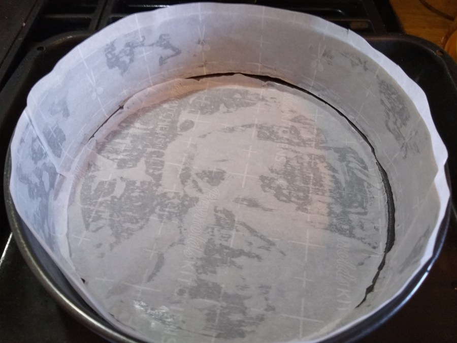 Then it’s ready to go in the pan, which is greased (to make the paper stick) and lined with parchment paper. I bought some parchment paper for this recipe, but used a ten inch springform pan I found in the street. The recipe calls for a nine inch pan, so the cake will be a little shorter.