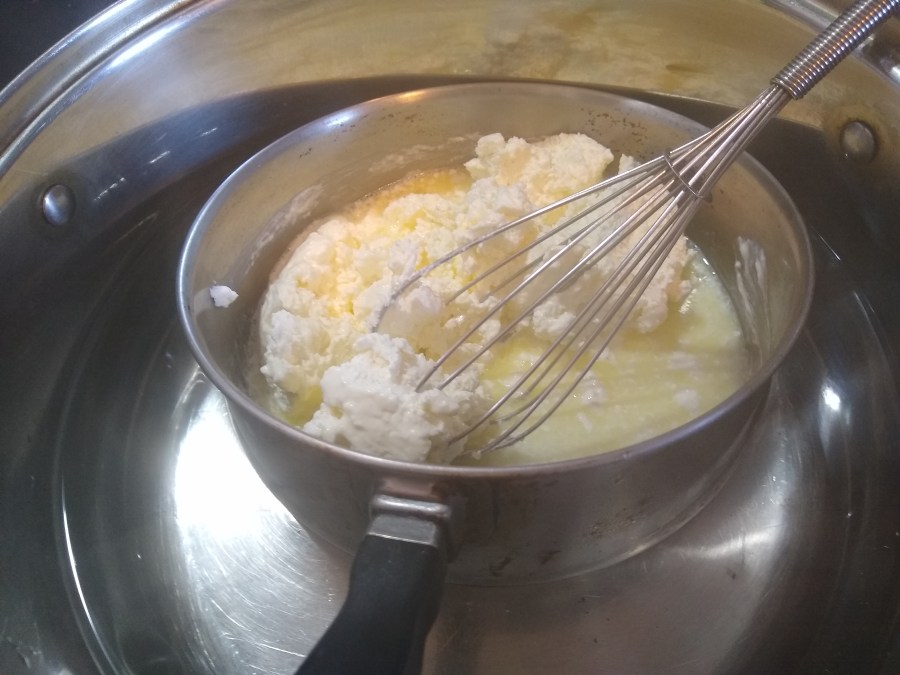 The first step is to melt together the butter, cream cheese and milk in a double boiler, then add vanilla and egg yolks, and sift in the dry ingredients. The recipe specifies cake flour, which has a bit less gluten than all-purpose flour. To compensate, I used a tablespoon less flour and a tablespoon more cornstarch. The zest and juice are added once the flour, salt, and cornstarch are incorporated. Everything in the cake was dumpstered except for the sugar, salt, cornstarch, and cream of tartar. While doing this I also put on a kettle of water to boil, which I would need for baking.