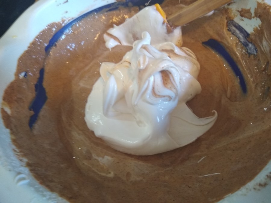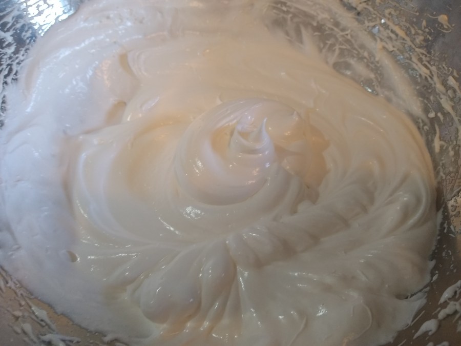 The next step is to whip all the whites, with the cream of tartar, to stiff peaks. The eggs whipped very quickly compared to the boxed egg whites I used for my meringues; I guess that’s the difference using whole eggs makes. I will have to try making them again. This is added in parts to the cheese mixture, first about a quarter stirred in quickly then the rest gently folded in about half of a third at a time.