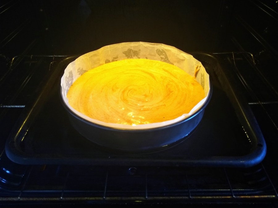 The cake needs to be cooked in a water bath, so I used my oven’s broiler pan to set the springform pan in. Then I poured the batter into the springform pan and put it, with the broiler pan underneath, into the oven. Then I filled the broiler pan with hot water and baked the cake for an hour.