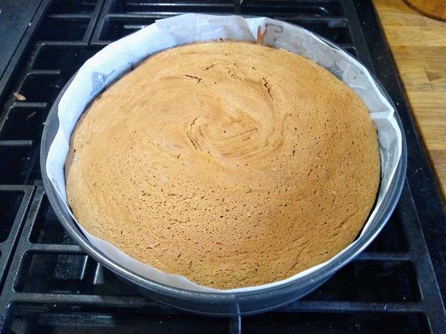 After the cake completely cooled, I removed it from the pan. The bottom of the cake was soggy; it looked like water had seeped into the pan from the water bath. I moved the cake onto some paper towels, hoping to soak up the excess moisture, then put it back in the oven upside-down at 215°F for 40 minutes to dry it out. The cake was certainly much shorter than it was supposed to be, which meant I would have to put the whipped cream on top instead of splitting it and putting it in the middle. I set the cake back on the base of the springform pan so I could use it to transport the cake, and put the metal bowl and hand mixer beaters in the freezer.
