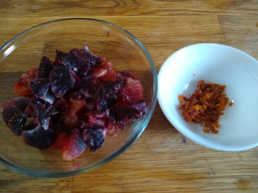 I used the zest and flesh of three blood oranges to make some glazed oranges by boiling them briefly in sugar, water, and tapioca starch, then straining out most of the liquid.