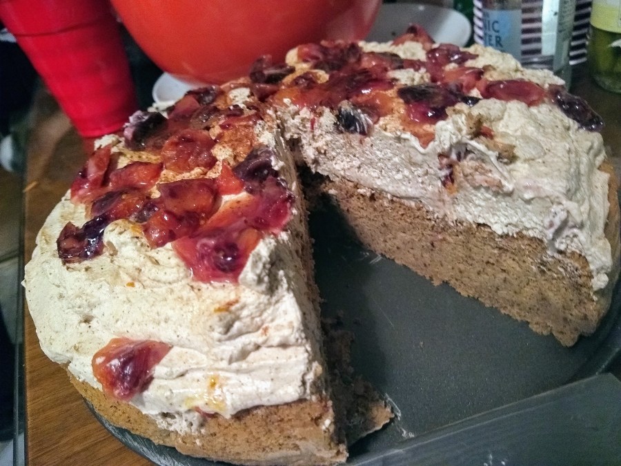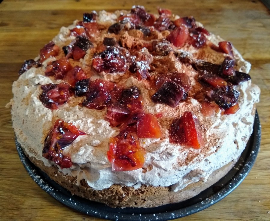 Then I made chocolate whipped cream by combining 2 tablespoons each of cocoa powder and sugar to a pint of cream and whipping it in the cold bowl, then topped the cake with the whipped cream, oranges, and dusted it with cocoa powder and powdered sugar.