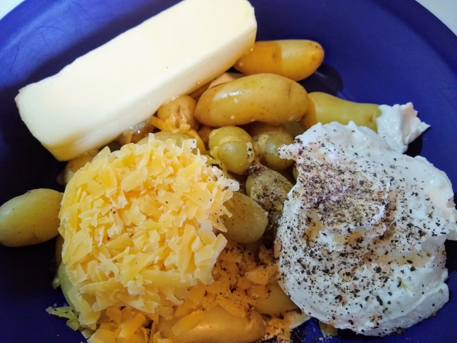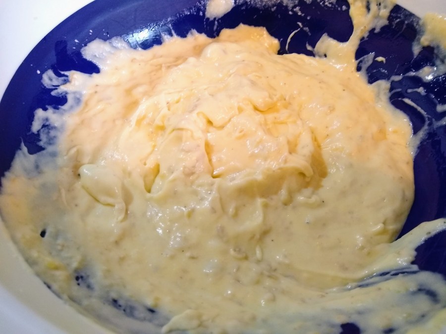 For the filling, I started by boiling a pound of little yellow potatoes, then used a stick blender to mix them with a stick of butter*, half a cup of sour cream, half a cup of shredded aged Gouda, 1/4 cup of milk, some salt and pepper, then put it in the fridge while working on the dough.