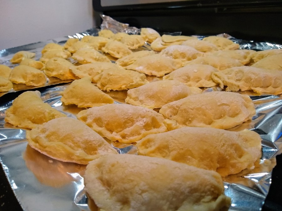 Then I assembled the pierogies by placing about a tablespoon of filling in the center of each circle, moistening the edge of one side, and pinching them together, stretching the dough around the filling. I boiled the pierogies a dozen at a time until they floated, then let most of them cool and froze them.