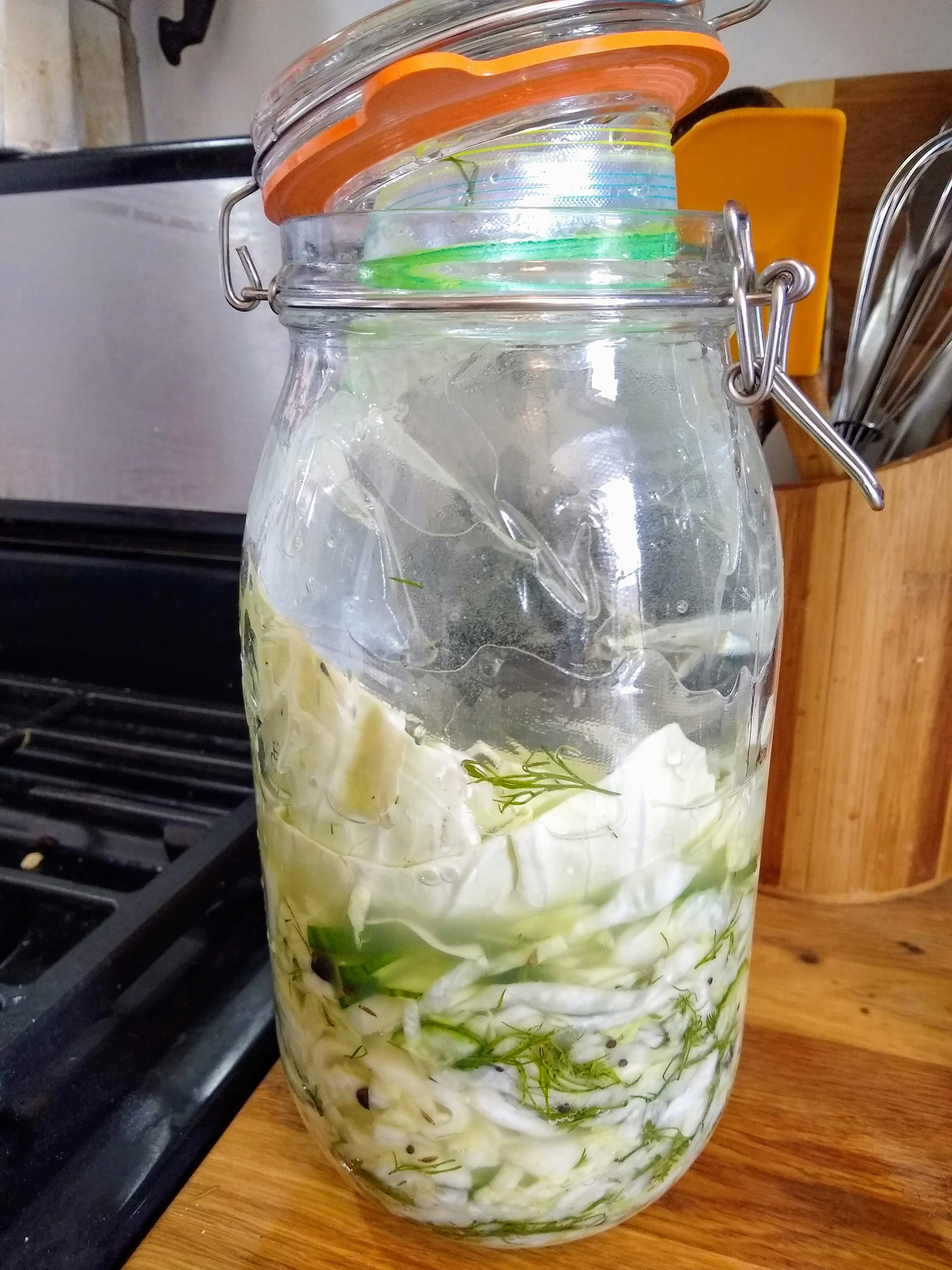 Then I added some dill**, garlic, mustard seeds, caraway seeds*, juniper berries*, and cucumber. I pressed all of this down into a jar until the brine rose above the cabbage and used the reserved leaves to press it down further, and put a plastic bag full of water inside the jar to weigh it down. I left the top open so gases could escape. Every few days I pressed the cabbage back down into the bottom of the jar, as air bubbles caused it to expand. Five days later it was ready and I packed it into smaller containers in the fridge.