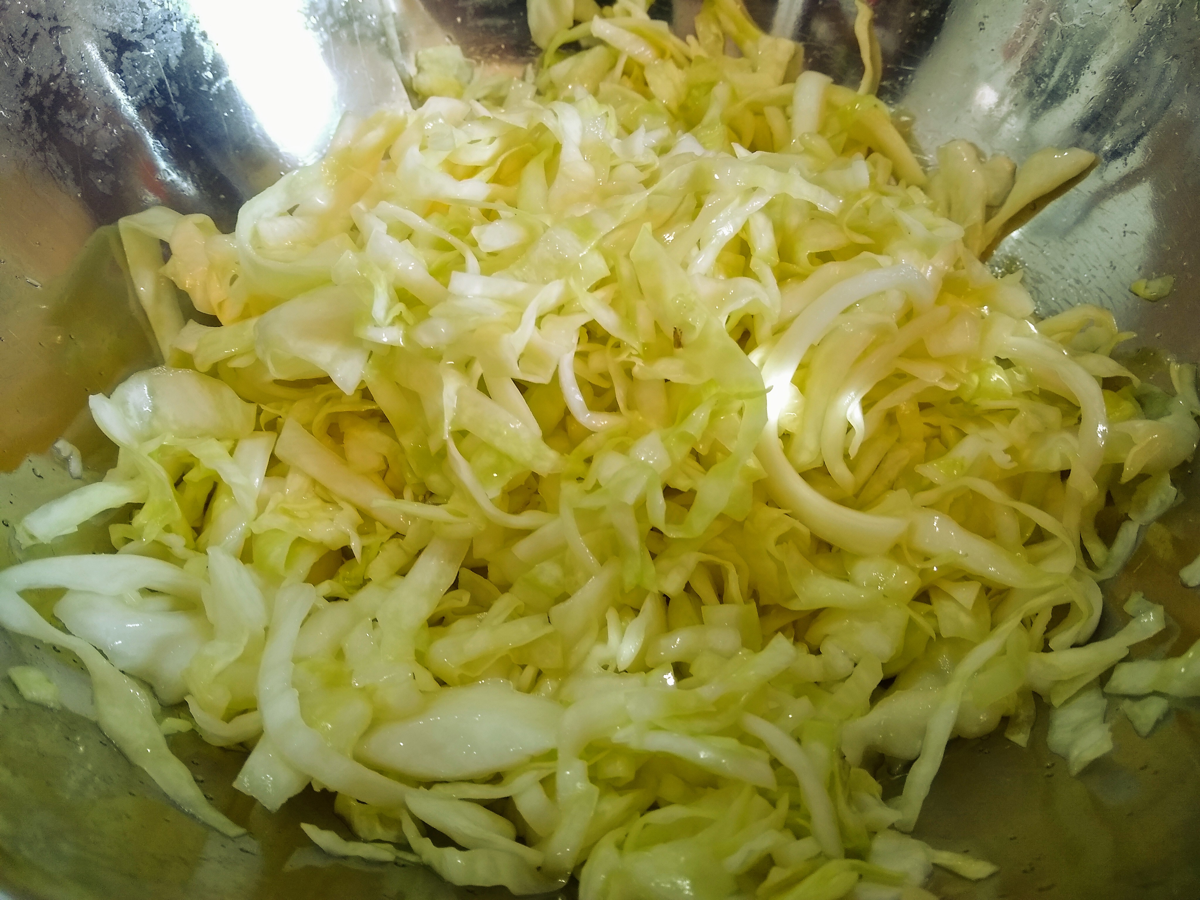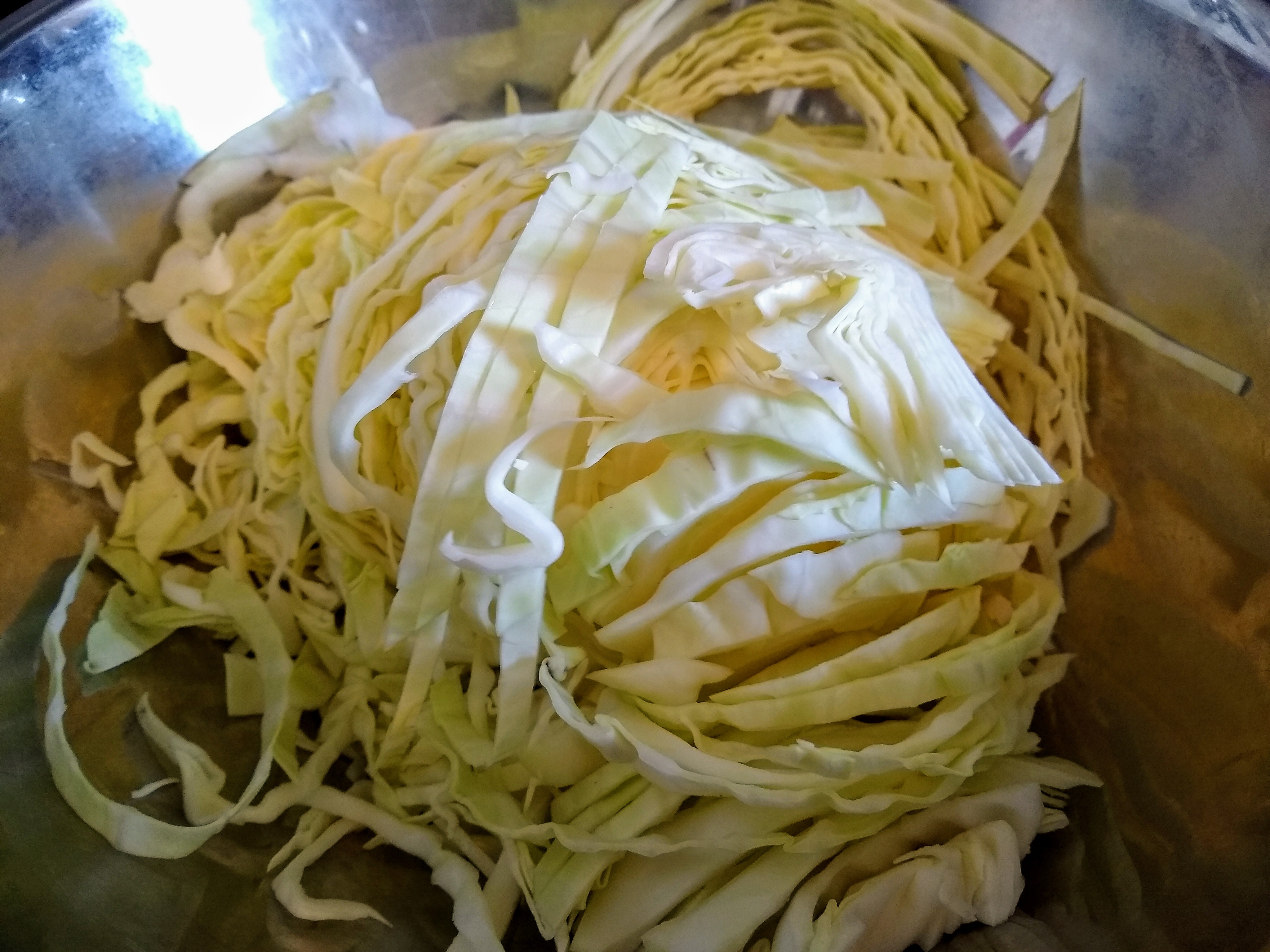 First I removed a few whole outer leaves from the cabbage and set them aside, and sliced the rest. I added a few tablespoons of salt* to the sliced cabbage, massaging it in. I was told not to use iodized salt, but I did anyway and the result was fine. I continued squeezing the cabbage until it began to turn green and release brine.