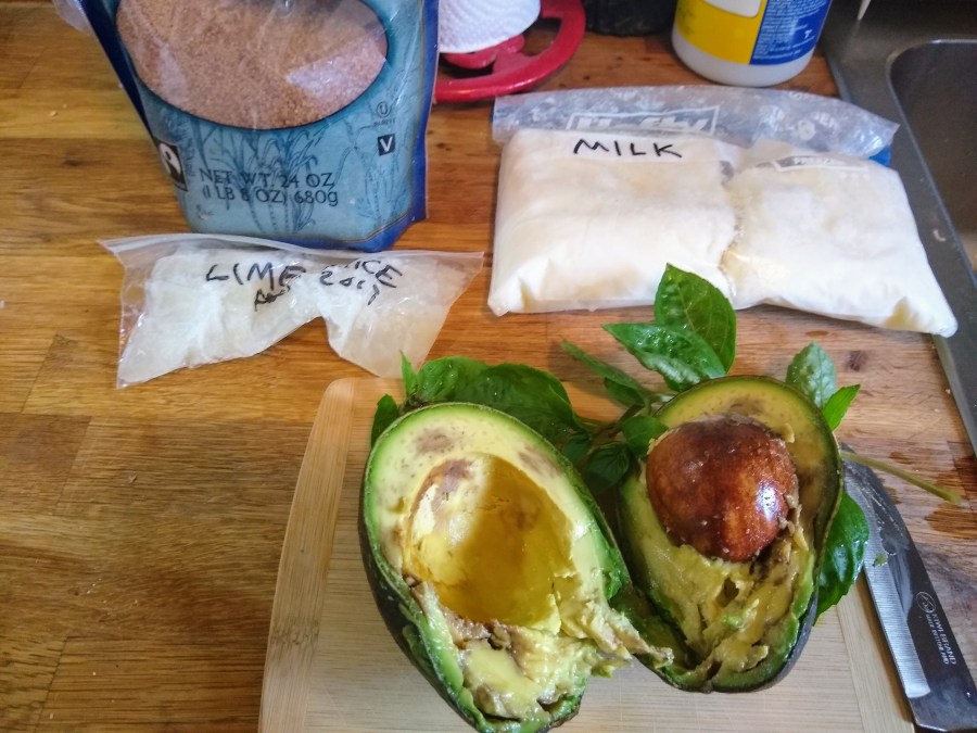 The basic recipe is to blend an avocado with ice, milk, and sweetened condensed milk. I don’t have sweetened condensed milk, but I have sugar. And since my milk is frozen, I blended about half a cup of frozen milk with about half a cup of water instead of regular milk and ice. I used about 3 tablespoons of turbinado sugar, adjusting the amounts of ingredients until it was the right consistency and sweetness.