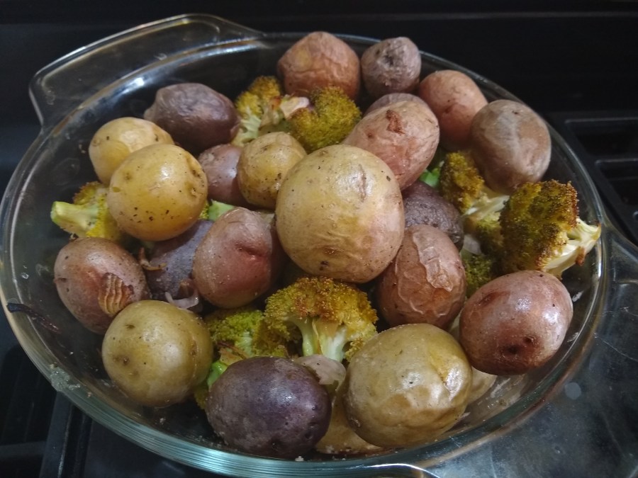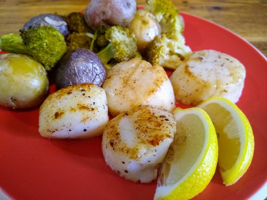 I thawed them in ice water with salt and lemon juice after reading some stuff about dry and wet scallops and being pretty sure these are wet scallops because they’re pretty white. While preparing the scallops I roasted some broccoli and potatoes with shallots with olive oil, salt and pepper.