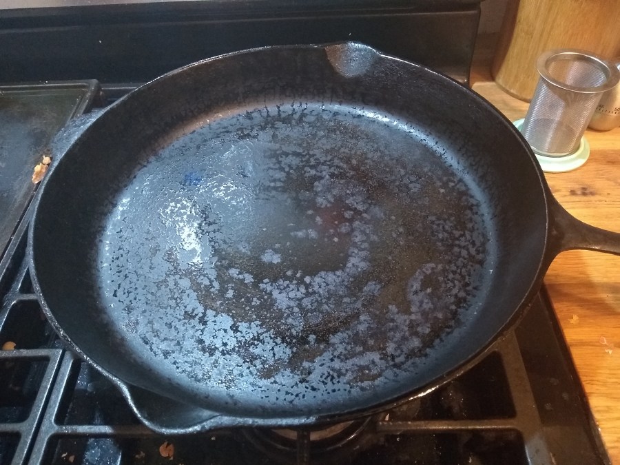 On the way home from work Tuesday I found an enormous 15 inch cast iron skillet out on the curb. I carried it about a mile home, stripped and reseasoned it with olive oil.