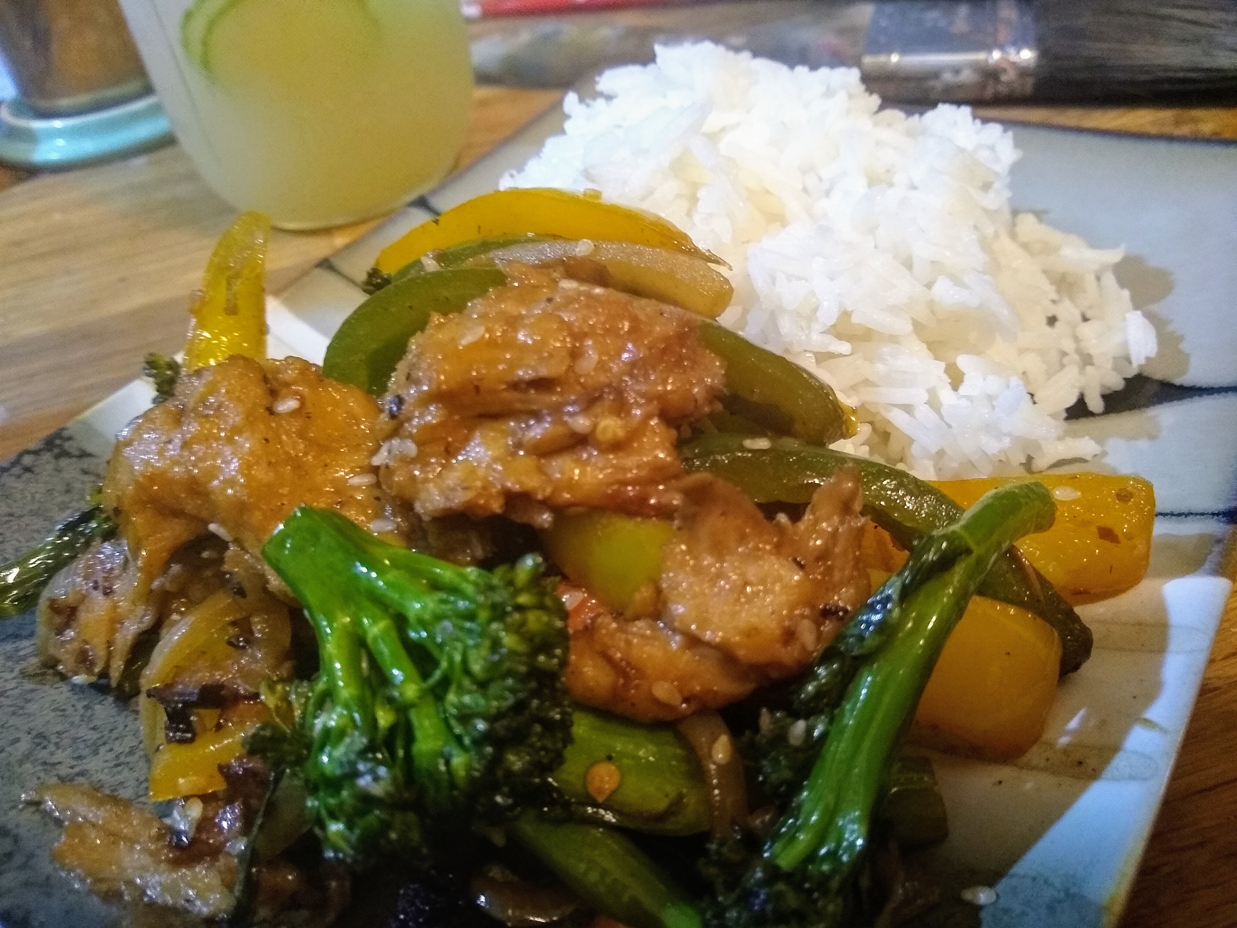 This week I found a couple of unexpected items: some “chicken style” seitan chunks packaged in a tofu-style container, a bottle of cooking sake, baby broccoli, and a couple of nice bell peppers. With some other ingredients (carrots, onion, garlic, ginger, soy sauce, hoisin sauce, lime juice, a little leftover pineapple juice) I was able to put together a stir fry.